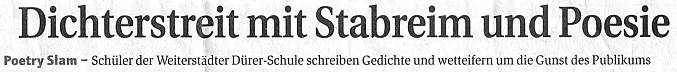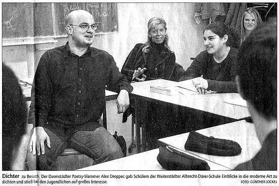WEITERSTADT. Kommt die künftige Dichtergeneration aus Weiterstadt? Zumindest hoffnungsvolle Talente kristallisierten sich bei dem Poetry Slam (Dichterstreit) in der Albrecht -Dürer - Schule (ADS) heraus. Dies stellten der Darmstädter Autor Fritz Deppert und Live - Dichter Alex Dreppec aus Darmstadt bei den Workshops in der ADS fest. Der so genannte Poetry Slam entstand Mitte der achtziger Jahre in Chicago und ist zwischenzeitlich in Deutschland in den literarischen Zirkeln weit verbreitet. In einem Workshop schreiben die Poeten schnelle rhythmische Gedichte und tragen sie in einem Wettbewerb untereinander vor. Das Publikum entscheidet dann anschließend, wer gewonnen hat.